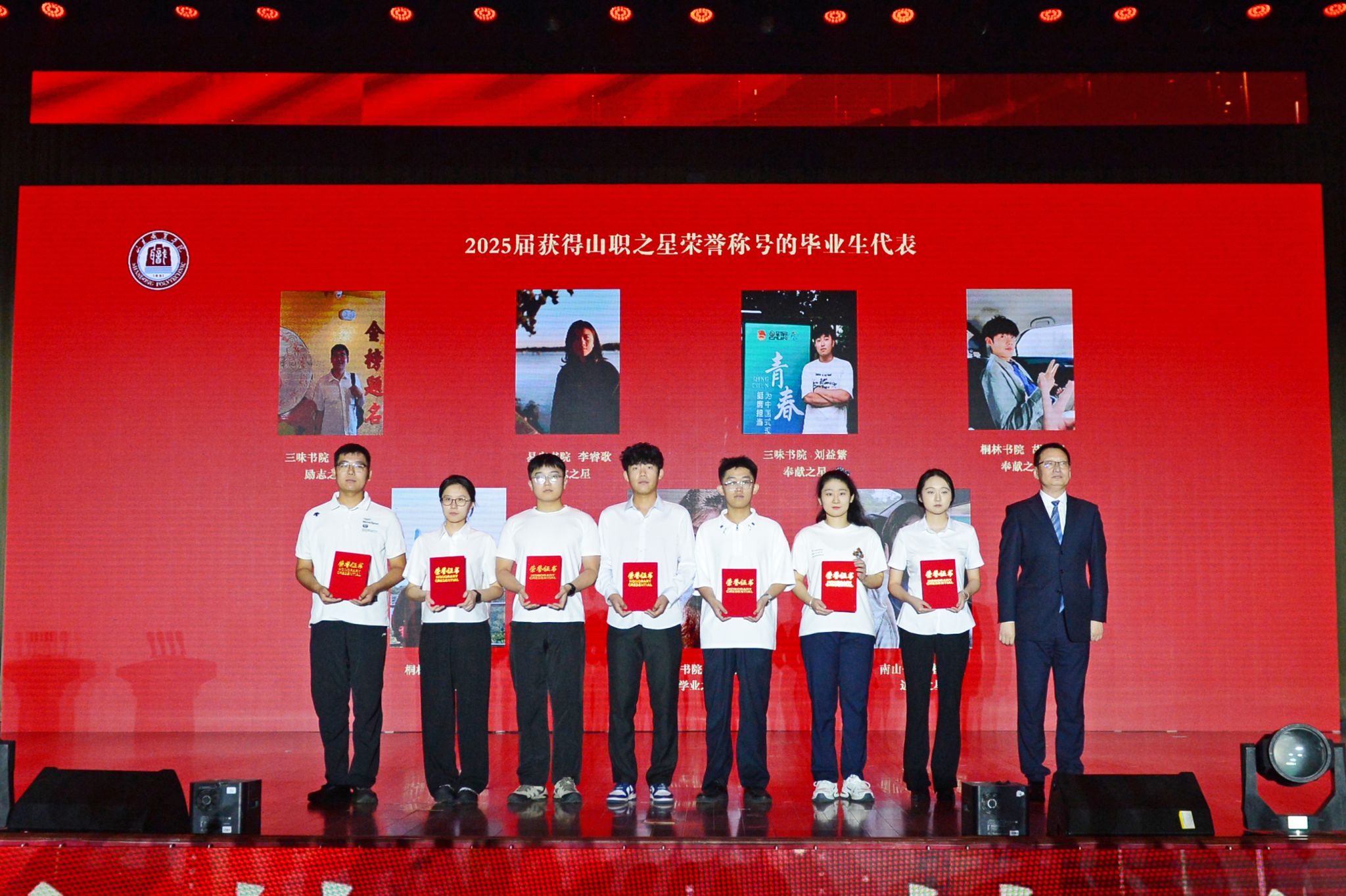 黨委書記趙鳳文為優秀畢業生代表頒發畢業證書,院長郭培謙為“山職之星”榮譽稱號獲得者頒發證書,副院長李新華、張少飛分別為獲得“表現突出獎”及國(guo)家、省市獎學金畢業生代表頒(ban)發證(zheng)書。