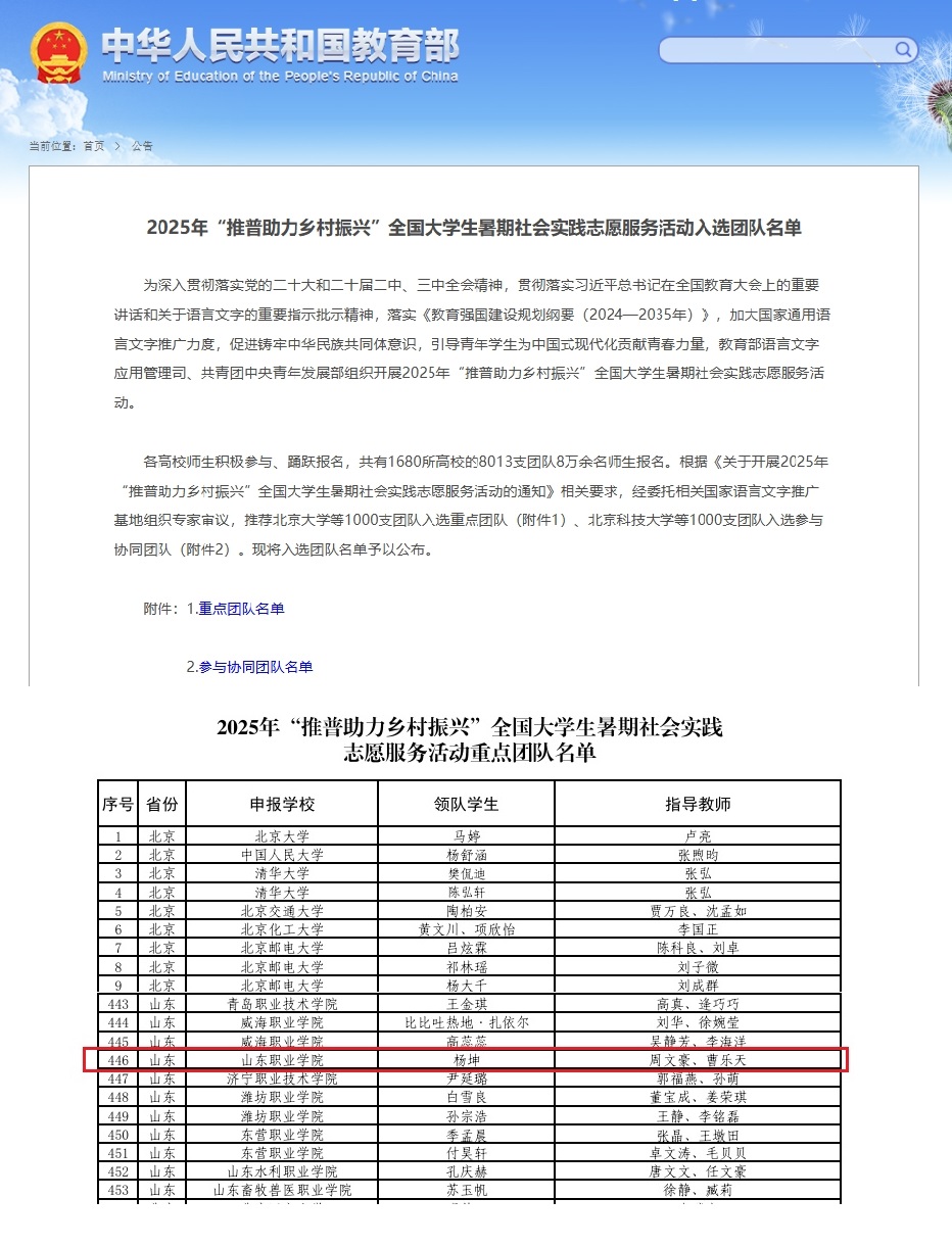 近日,《2025年(nian)“推(tui)普助(zhu)力鄉(xiang)村振興”全(quan)國大學生暑(shu)(shu)期社(she)會實踐志(zhi)(zhi)(zhi)愿(yuan)(yuan)服(fu)務活(huo)(huo)動(dong)入選(xuan)團隊名單(dan)》和《關于公布(bu)2025年(nian)“志(zhi)(zhi)(zhi)愿(yuan)(yuan)有我(wo)·讓愛飛(fei)躍萬(wan)水千(qian)山”魯(lu)喀專(zhuan)項(xiang)志(zhi)(zhi)(zhi)愿(yuan)(yuan)支教(jiao)團隊名額(e)分配(pei)情(qing)況的通知》發布(bu),我(wo)校“山職號·喀什行”志(zhi)(zhi)(zhi)愿(yuan)(yuan)服(fu)務隊入選(xuan)教(jiao)育部2025年(nian)“推(tui)普助(zhu)力鄉(xiang)村振興”全(quan)國大學生暑(shu)(shu)期社(she)會實踐志(zhi)(zhi)(zhi)愿(yuan)(yuan)服(fu)務活(huo)(huo)動(dong)重點團隊名單(dan),同時入選(xuan)2025年(nian)“志(zhi)(zhi)(zhi)愿(yuan)(yuan)有我(wo)·讓愛飛(fei)躍萬(wan)水千(qian)山”魯(lu)喀專(zhuan)項(xiang)志(zhi)(zhi)(zhi)愿(yuan)(yuan)支教(jiao)團隊。