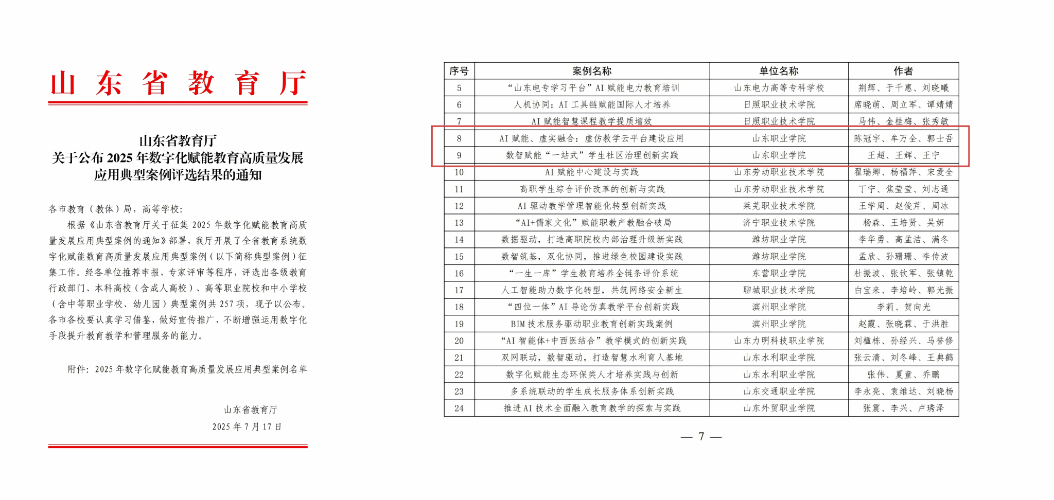 近日,山東省教(jiao)育(yu)廳公布(bu)了(le)2025年(nian)數字化賦能(neng)教(jiao)育(yu)高質(zhi)量(liang)發展應(ying)用典型案例(li)評(ping)選(xuan)結(jie)果(guo),我校(xiao)報送的《AI賦能(neng)、虛(xu)實(shi)融合:虛(xu)仿教(jiao)學(xue)(xue)云平臺建設應(ying)用》和《數智(zhi)賦能(neng)“一(yi)站(zhan)式”學(xue)(xue)生社區治理創(chuang)新實(shi)踐》兩項案例(li)成功入選(xuan)。