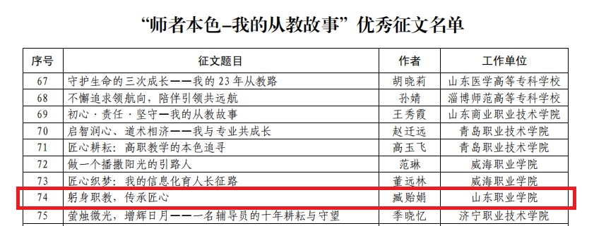 7月(yue)22日,山東(dong)省教育廳發布(bu)(bu)《關(guan)于公布(bu)(bu)“師(shi)者本色——我的(de)從教故(gu)事(shi)”優秀征(zheng)文(wen)的(de)通知》,我校智(zhi)能制造(zao)學院機械制造(zao)及自(zi)動(dong)化專業教師(shi)臧貽娟的(de)《躬身(shen)職教,傳承匠心》獲優秀征(zheng)文(wen)。