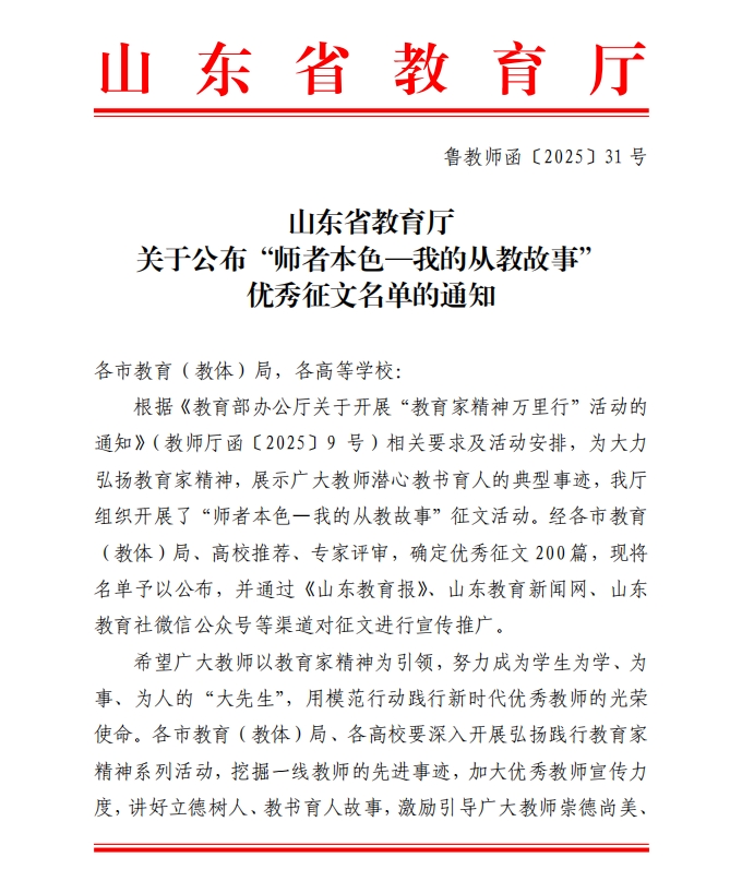 本次“師者本色(se)——我的從教故事”征(zheng)文(wen)(wen)活(huo)動由(you)山東(dong)省教育(yu)廳組(zu)織開展,圍(wei)繞(rao)理想(xiang)信念、道(dao)德情(qing)操、育(yu)人(ren)智(zhi)慧等(deng)六個主(zhu)題,經各市教育(yu)(教體)局、高校推薦,專家評審,共確定優秀征(zheng)文(wen)(wen)200篇(pian),其中(zhong)高等(deng)教育(yu)組(zu)103篇(pian)。獲獎作品將通過《山東(dong)教育(yu)報(bao)》、山東(dong)教育(yu)新聞(wen)網、山東(dong)教育(yu)社微(wei)信公眾號等(deng)渠道(dao)對征(zheng)文(wen)(wen)進行宣傳推廣。