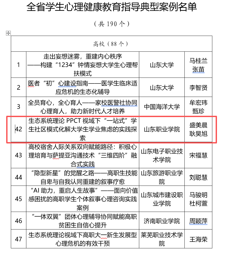 近日,山東省教(jiao)(jiao)育(yu)廳公布了“2025年山東省學(xue)生(sheng)心理(li)(li)健康宣(xuan)傳(chuan)教(jiao)(jiao)育(yu)月系(xi)列(lie)活動”評(ping)選結(jie)果(guo),我(wo)校報送的心理(li)(li)健康教(jiao)(jiao)育(yu)案(an)例《生(sheng)態(tai)系(xi)統理(li)(li)論PPCT視(shi)域下“一站式”學(xue)生(sheng)社區模式化解大學(xue)生(sheng)學(xue)業焦(jiao)慮(lv)的實(shi)踐探索》入選“山東省學(xue)生(sheng)心理(li)(li)健康教(jiao)(jiao)育(yu)指(zhi)導典型案(an)例”。