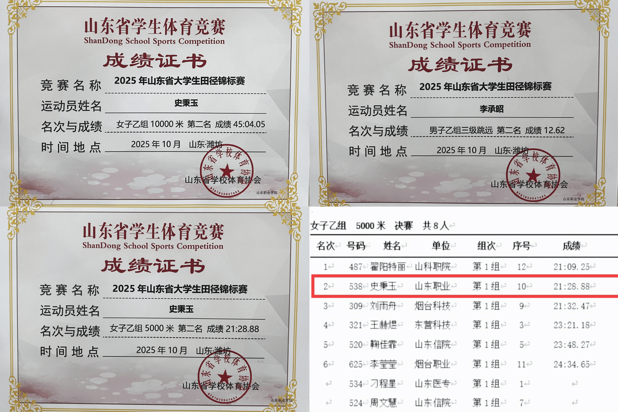 10月8日至14日,由(you)山(shan)東(dong)(dong)省(sheng)學(xue)校體育協會主辦、山(shan)東(dong)(dong)信(xin)息職業技術學(xue)院承(cheng)辦的(de)2025年(nian)山(shan)東(dong)(dong)省(sheng)大學(xue)生(sheng)田徑錦(jin)標賽(sai)在濰坊(fang)奧林匹克體育公園舉行。本次(ci)比賽(sai)共有來自16個(ge)地市、68所(suo)高(gao)校的(de)776名高(gao)校運動(dong)員參賽(sai)。我(wo)校獲男子乙(yi)組三級跳(tiao)遠、女子乙(yi)組5000米、女子乙(yi)組10000米三項亞(ya)軍(jun)。
