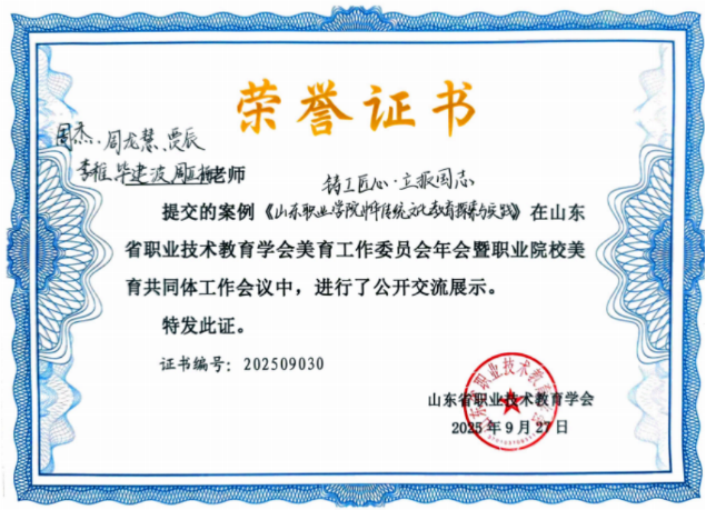 2025年山東省職業院校教學(xue)能力大賽(sai)與美(mei)(mei)育優(you)秀案例展(zhan)示活動(dong)相繼收官,我校美(mei)(mei)育工作喜訊(xun)頻(pin)傳,在多個領域(yu)斬獲佳績。