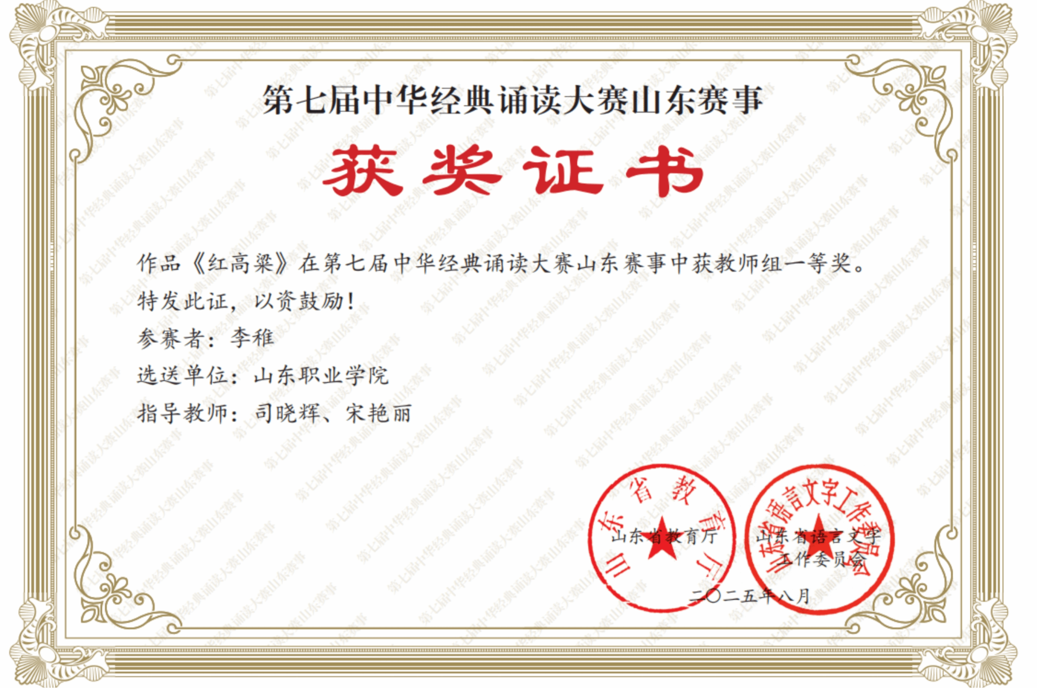 在第七屆中華(hua)經典誦讀大賽(sai)(sai)中,體育美育教(jiao)學部(bu)教(jiao)師李稚憑(ping)借(jie)作品《紅高粱》,斬(zhan)獲全(quan)省教(jiao)師組一等獎并順(shun)利晉(jin)級國賽(sai)(sai),實現了我校(xiao)在該領域的突破(po)。