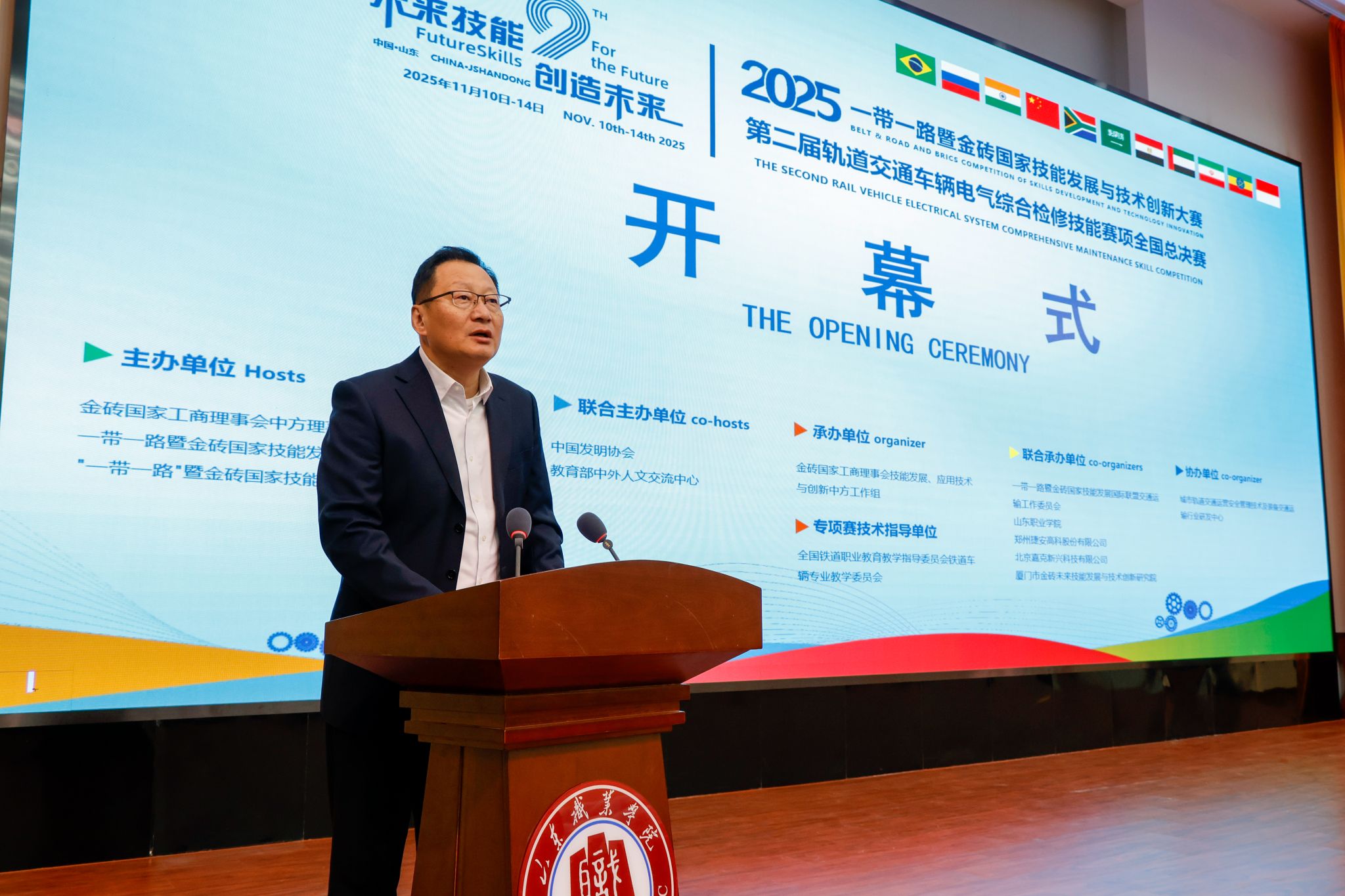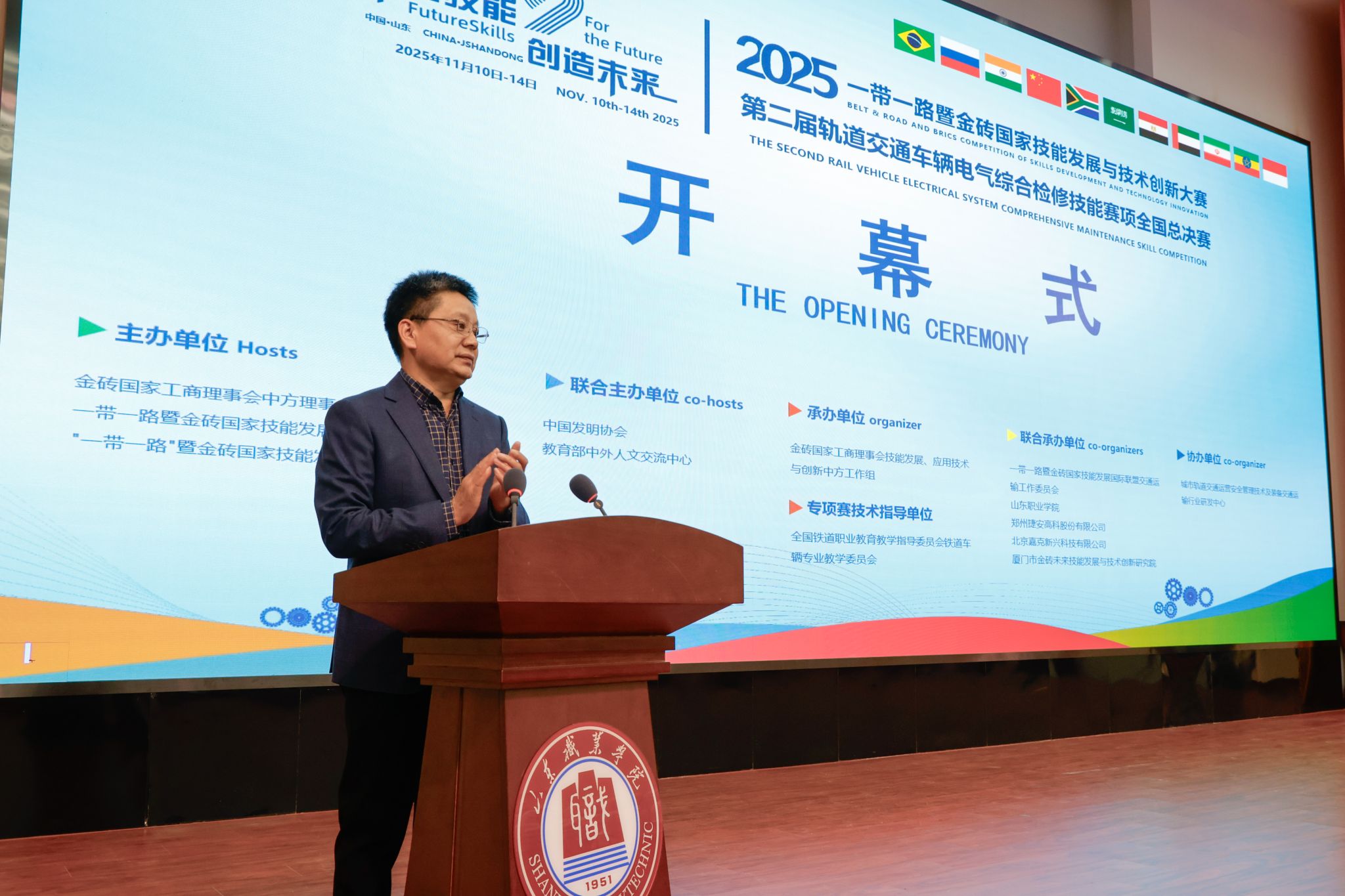 11月11日,2025一帶一路(lu)暨金磚(zhuan)國家(jia)技(ji)(ji)能(neng)(neng)發展(zhan)與技(ji)(ji)術(shu)創(chuang)新大(da)賽(sai)之第二屆軌道(dao)(dao)交通車輛(liang)電氣(qi)綜(zong)合檢修技(ji)(ji)能(neng)(neng)賽(sai)項全國總(zong)決賽(sai)在(zai)我(wo)校舉行(xing)。全國鐵道(dao)(dao)行(xing)業(ye)職業(ye)教育(yu)教學指(zhi)導委(wei)員(yuan)(yuan)會鐵道(dao)(dao)車輛(liang)專業(ye)委(wei)員(yuan)(yuan)會主任、吉林鐵道(dao)(dao)職業(ye)技(ji)(ji)術(shu)大(da)學校長(chang)曹炳志,我(wo)校黨委(wei)副書(shu)記、院長(chang)郭培謙,金磚(zhuan)國家(jia)技(ji)(ji)能(neng)(neng)發展(zhan)與技(ji)(ji)術(shu)創(chuang)新大(da)賽(sai)組委(wei)會執行(xing)委(wei)員(yuan)(yuan)會競賽(sai)辦(ban)公(gong)室國際處(chu)副處(chu)長(chang)高明,大(da)賽(sai)裁判長(chang)、濟南車輛(liang)段人事科(ke)長(chang)胡懂業(ye),鄭州捷安高科(ke)股(gu)份(fen)有限(xian)公(gong)司總(zong)經理高志生等嘉賓出(chu)席開幕(mu)式(shi)。開幕(mu)式(shi)由副院長(chang)李(li)新華主持。
