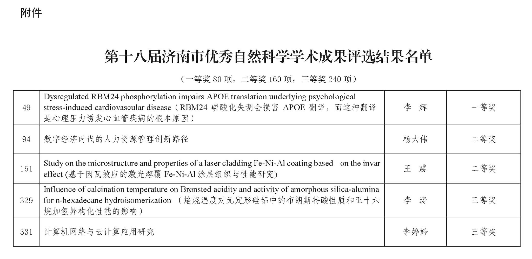 生物工(gong)(gong)程(cheng)學(xue)院教師(shi)(shi)李(li)輝的(de)(de)《Dysregulated RBM24 phosphorylation impairs APOE translation underlying psychological stress-induced cardiovascular disease(RBM24 磷酸(suan)化失(shi)調會(hui)損害 APOE 翻譯,而這種翻譯是心理(li)壓力(li)誘發心血管疾病的(de)(de)根(gen)本原因(yin))》獲得(de)(de)一等(deng)獎(jiang)(jiang);管理(li)學(xue)院教師(shi)(shi)楊大偉的(de)(de)《數字經濟時代的(de)(de)人力(li)資源管理(li)創新路徑》,城市軌(gui)道學(xue)院教師(shi)(shi)王震的(de)(de)《Study on the microstructure and properties of a laser cladding Fe-Ni-Al coating based on the invareffect(基(ji)于因(yin)瓦效(xiao)應的(de)(de)激光熔覆(fu)Fe-Ni-A1涂層組織與(yu)性(xing)能研究)》獲得(de)(de)二等(deng)獎(jiang)(jiang);生物工(gong)(gong)程(cheng)學(xue)院教師(shi)(shi)李(li)濤的(de)(de)《Influence of calcination temperature on Bronsted acidity and activity of amorphous silica-alumina for n-hexadecane hydroisomerization(焙燒溫度對無定形硅鋁中的(de)(de)布朗(lang)斯特酸(suan)性(xing)質和正十六烷加氫(qing)異構化性(xing)能的(de)(de)影(ying)響)》,新一代信息技術學(xue)院教師(shi)(shi)李(li)婷(ting)(ting)婷(ting)(ting)的(de)(de)《計算(suan)機網(wang)絡與(yu)云計算(suan)應用研究》獲得(de)(de)三(san)等(deng)獎(jiang)(jiang)。