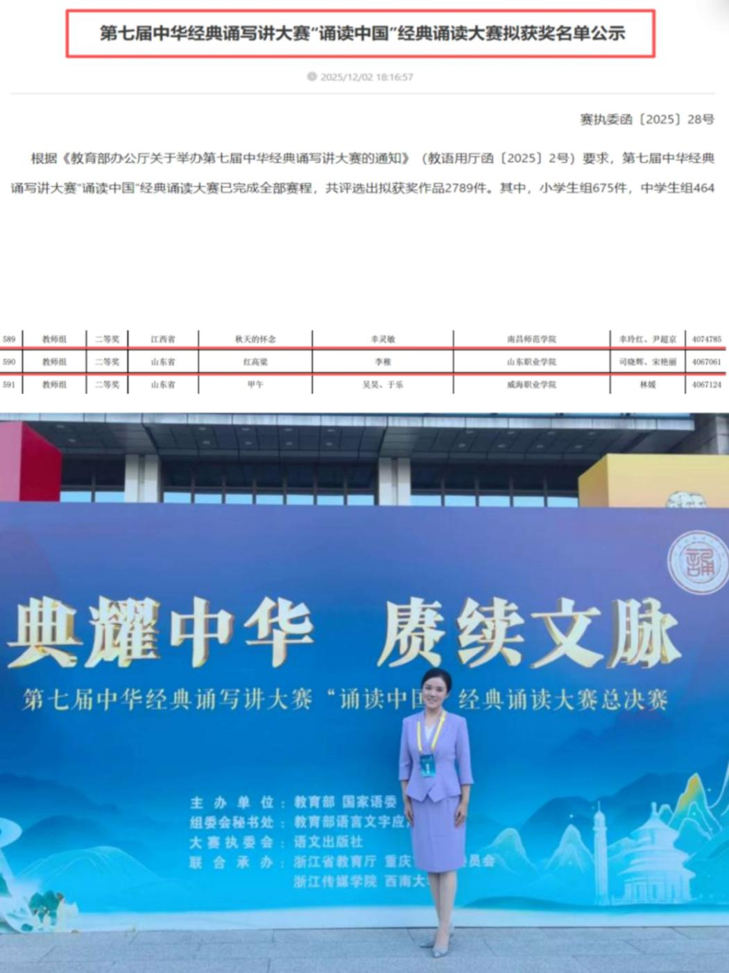 在第七屆中華經(jing)典誦寫講大(da)賽(sai)“誦讀(du)中國”經(jing)典誦讀(du)大(da)賽(sai)全國賽(sai)中,我校體育(yu)美育(yu)教(jiao)學(xue)部(bu)教(jiao)師李稚憑借深厚的(de)(de)語言(yan)藝術功底與出色的(de)(de)舞臺表現(xian),榮獲國家級二等獎,展(zhan)現(xian)了我校教(jiao)師美育(yu)融合教(jiao)學(xue)的(de)(de)扎實(shi)成效。