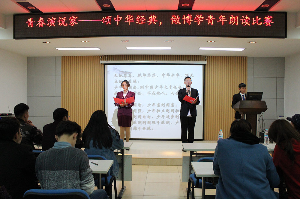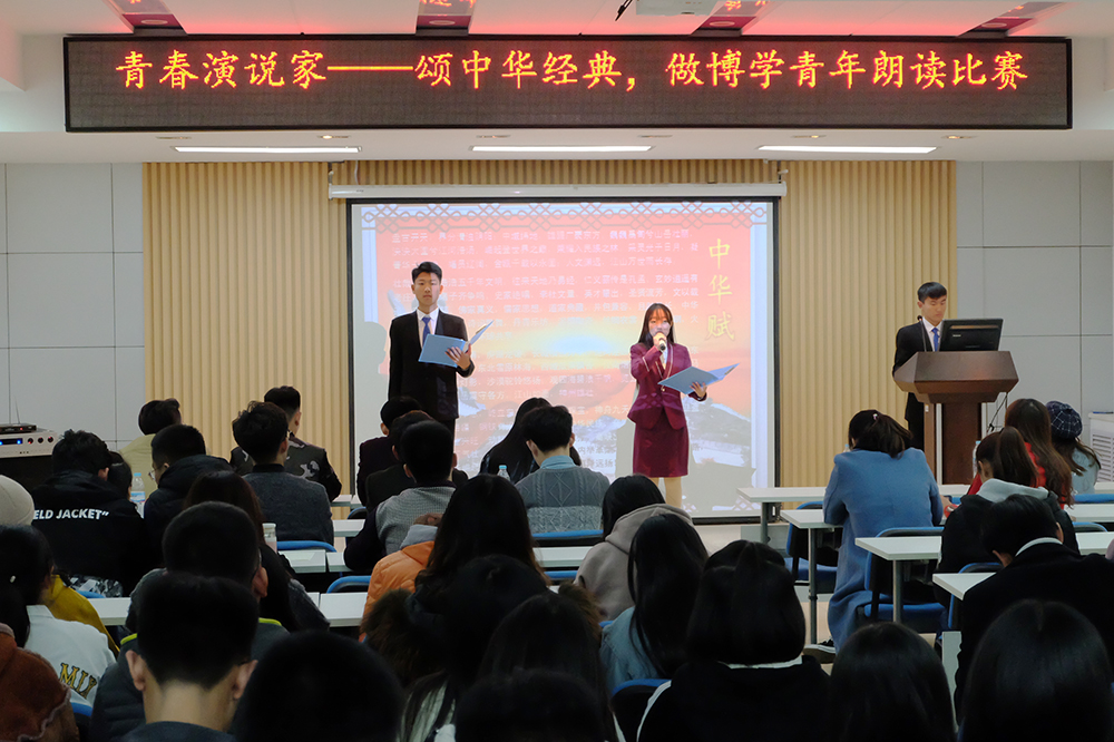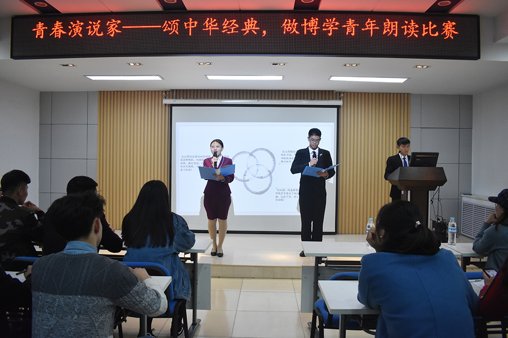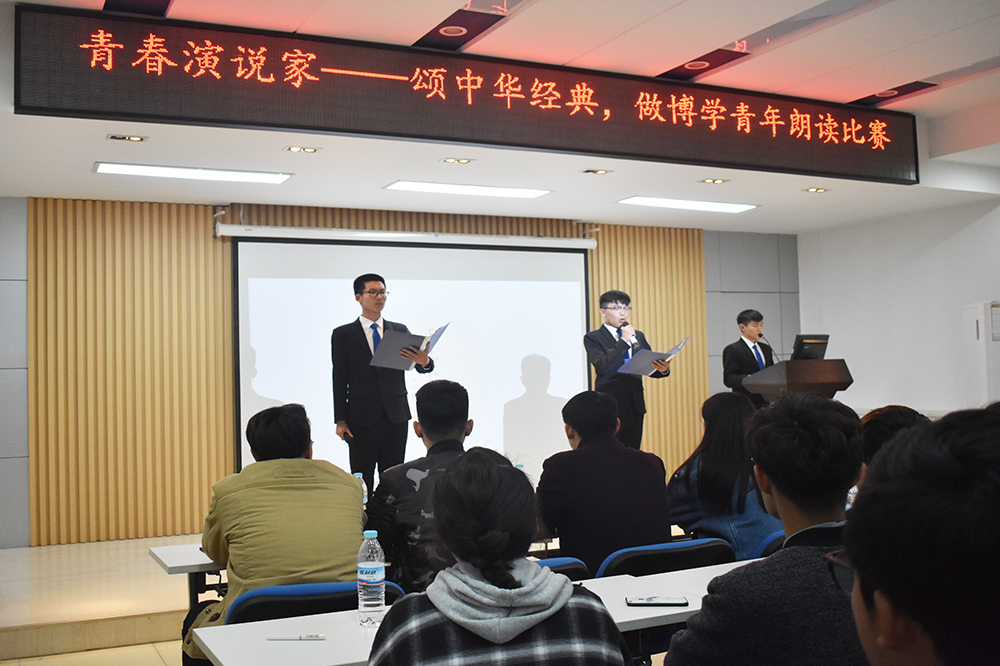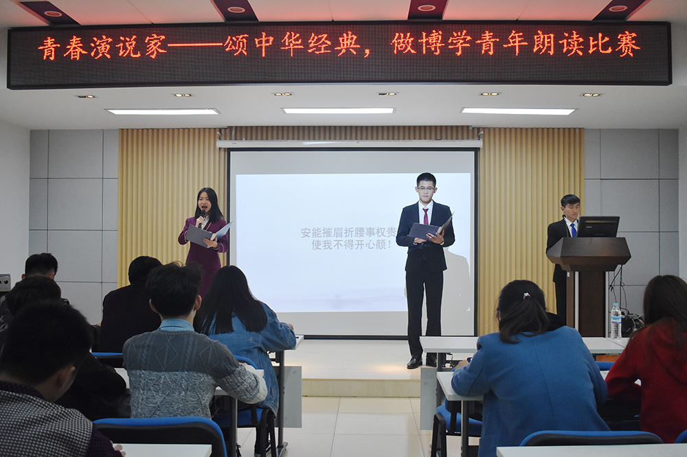 經(jing)(jing)(jing)過預賽,共(gong)有十組選(xuan)手參加本(ben)次決賽。各組選(xuan)手在比(bi)賽過程(cheng)中皆聲(sheng)情并茂,為觀眾(zhong)帶(dai)來一(yi)個又一(yi)個精彩的(de)表演。鐵道交通(tong)運營(ying)管(guan)理1833班(ban)的(de)韓堃、吳潤澤的(de)《誦(song)中華經(jing)(jing)(jing)典》,通(tong)過朗誦(song)辛棄疾、譚(tan)嗣同、曹操、李清照的(de)經(jing)(jing)(jing)典詩句,讓同學們感(gan)受詩詞的(de)韻律美(mei)和(he)愛(ai)國情懷。鐵路物流1831班(ban)張明惠誦(song)讀(du)的(de)《春江花月(yue)夜》將大(da)家帶(dai)入深沉、寥廓、寧靜優美(mei)的(de)境界。鐵道交通(tong)運營(ying)管(guan)理1835班(ban)陳(chen)欣茹的(de)《蜀道難(nan)》、會計1831班(ban)仉(zhang)振(zhen)涵(han)、王(wang)興(xing)業誦(song)讀(du)的(de)《將進酒》,向大(da)家展現了詩人不畏權貴、蔑視仕途的(de)崇(chong)高(gao)品質。《少年中國說》、《承前啟后繼往開來》等(deng)朗誦(song),感(gan)情充沛,催人振(zhen)奮,贏得(de)全場掌聲(sheng)。經(jing)(jing)(jing)評比(bi),仉(zhang)振(zhen)涵(han)和(he)王(wang)興(xing)業獲得(de)一(yi)等(deng)獎,柳華健、李松(song)蓉和(he)閆晨昱、田悅獲得(de)二(er)等(deng)獎。