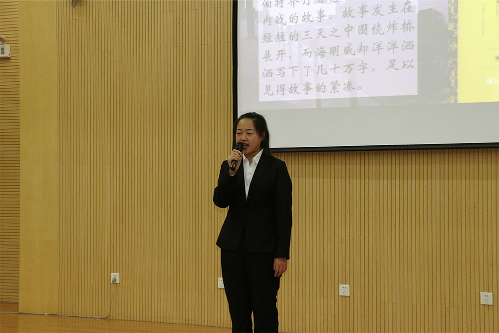 經過初賽(sai)與復賽(sai)選拔(ba),有12名同學成(cheng)(cheng)功進入(ru)決賽(sai)。首(shou)先登(deng)臺演講(jiang)的(de)(de)(de)是一(yi)號選手李雪,她為大家(jia)帶來書籍《瓦爾登(deng)湖》,簡樸的(de)(de)(de)生活,自然的(de)(de)(de)回歸,只言片語間便為大家(jia)營造出一(yi)片自然與人文和諧共存(cun)的(de)(de)(de)理想凈土(tu),伴(ban)著(zhu)舒緩的(de)(de)(de)音(yin)樂,整(zheng)場(chang)演講(jiang)一(yi)氣(qi)呵成(cheng)(cheng),觀眾(zhong)完全被(bei)她的(de)(de)(de)表現(xian)(xian)所吸引,全場(chang)掌聲(sheng)雷動,對一(yi)號選手的(de)(de)(de)表現(xian)(xian)予以肯(ken)定。