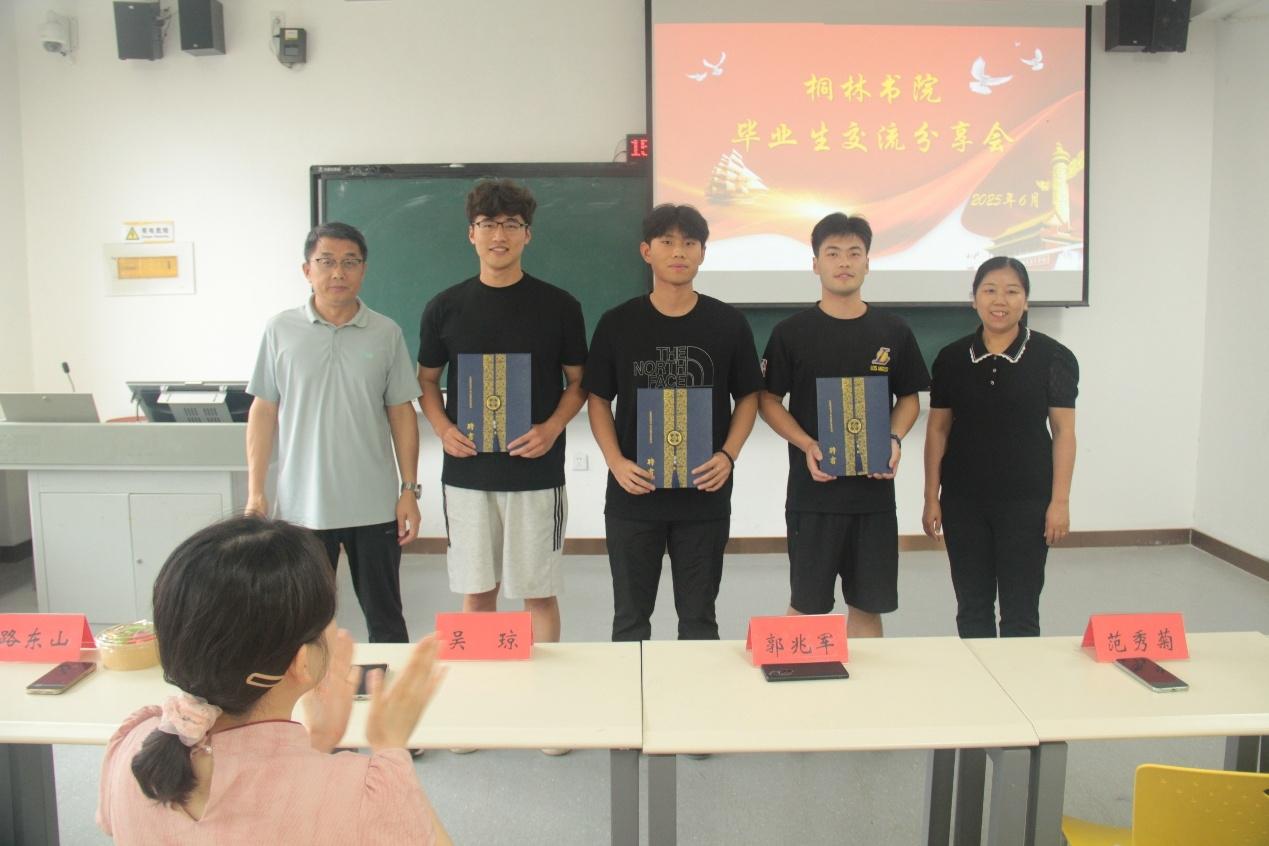 座談會上,2025屆優(you)秀畢(bi)業生(sheng)(sheng)(sheng)紀(ji)睿、路(lu)東山、龐皓(hao)文(wen)結合自(zi)身經歷,系統講(jiang)解(jie)了求職(zhi)(zhi)面(mian)試技巧(qiao)、職(zhi)(zhi)場發(fa)展路(lu)徑。他們還分(fen)(fen)享了在擔任學(xue)生(sheng)(sheng)(sheng)干(gan)部(bu)期間的(de)管理方法與成長(chang)感(gan)悟,鼓勵學(xue)生(sheng)(sheng)(sheng)們要提(ti)前(qian)做好規劃,積極參與實踐,努(nu)力(li)提(ti)升(sheng)個(ge)人綜合素質,勇于挑戰自(zi)我,在屬于自(zi)己(ji)的(de)人生(sheng)(sheng)(sheng)道路(lu)上穩步前(qian)行。最(zui)后,郭兆軍(jun)和范秀菊為(wei)紀(ji)睿、路(lu)東山、龐皓(hao)文(wen)三位優(you)秀畢(bi)業生(sheng)(sheng)(sheng)頒發(fa)證書(shu),對他們的(de)精彩分(fen)(fen)享給予高度肯(ken)定,也寄(ji)語在場同學(xue)以優(you)秀畢(bi)業生(sheng)(sheng)(sheng)為(wei)榜樣(yang),立足當下、腳踏實地,在學(xue)習、實踐與生(sheng)(sheng)(sheng)活中持續(xu)追求卓(zhuo)越,不斷提(ti)升(sheng)自(zi)我。