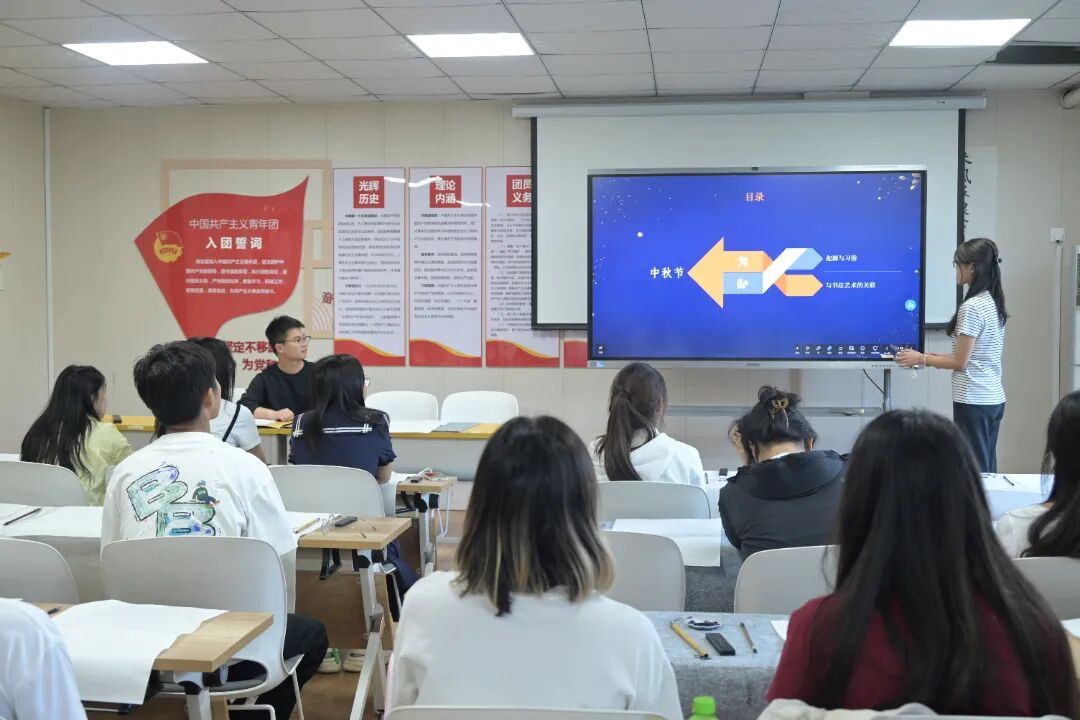 活動(dong)內容豐富,涵蓋文化講解、書(shu)法體(ti)驗、互動(dong)游戲等環節。活動開始,朱青雨同學以“月韻墨香·情滿中秋”為主題,帶同學們領略了《水調歌頭》《滿江紅》等詩詞之美。在書法體驗環節中,同學們手握毛筆,寫下對中秋團圓的期盼。在“Emoji”表情包猜謎語環節中,同學們踴躍參與,將現代網(wang)絡符號與中華優(you)秀傳統文化結合。活動現場氣氛活躍,歡聲笑語不斷。