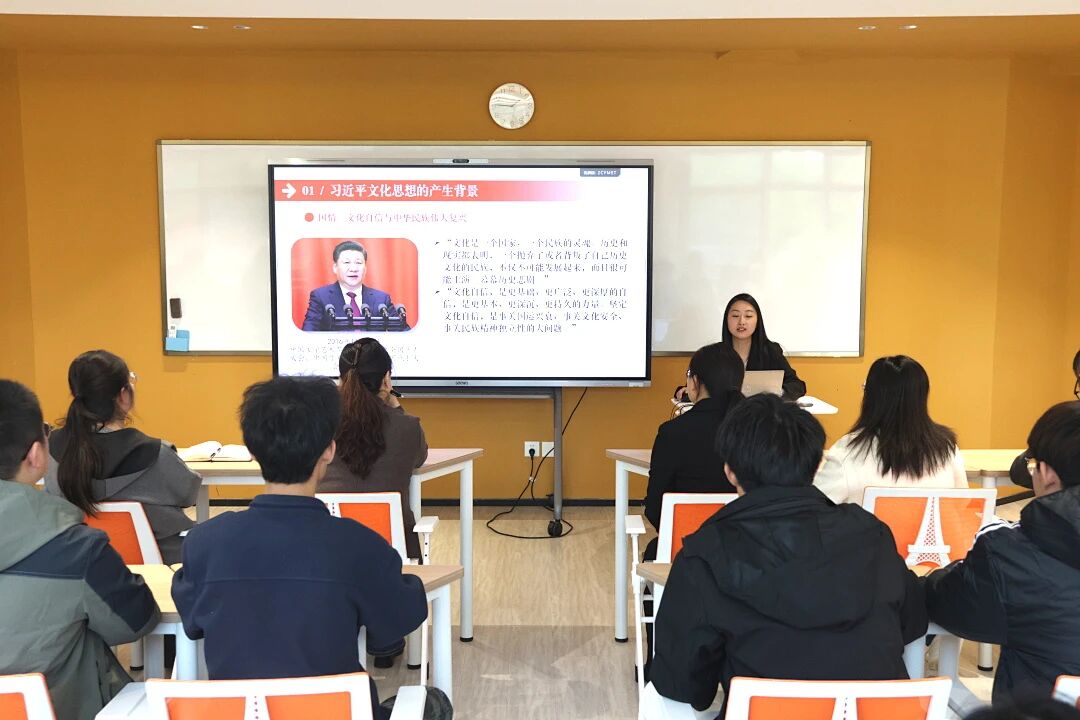 韓心怡以《習(xi)近(jin)平(ping)(ping)文(wen)(wen)(wen)(wen)化(hua)思想(xiang)(xiang)的(de)(de)(de)價值意蘊(yun)(yun)與(yu)實(shi)踐(jian)指向》為題,全(quan)面梳(shu)理(li)了(le)習(xi)近(jin)平(ping)(ping)文(wen)(wen)(wen)(wen)化(hua)思想(xiang)(xiang)的(de)(de)(de)產(chan)生(sheng)背景與(yu)提(ti)出(chu)過程(cheng),深刻(ke)剖析了(le)其價值意蘊(yun)(yun),明確闡釋(shi)了(le)其實(shi)踐(jian)指向。她(ta)指出(chu),習(xi)近(jin)平(ping)(ping)文(wen)(wen)(wen)(wen)化(hua)思想(xiang)(xiang)是在(zai)中(zhong)(zhong)華民(min)族偉(wei)大(da)復興戰略和世界(jie)百年未有(you)之大(da)變局相互(hu)(hu)交織、相互(hu)(hu)影響的(de)(de)(de)時(shi)代背景下(xia)產(chan)生(sheng)的(de)(de)(de),是新(xin)時(shi)代黨領導(dao)文(wen)(wen)(wen)(wen)化(hua)建設實(shi)踐(jian)經驗的(de)(de)(de)理(li)論(lun)總結,是堅持把馬克思主義基本原(yuan)理(li)同中(zhong)(zhong)國(guo)具體實(shi)際相結合(he)、同中(zhong)(zhong)華優秀傳統文(wen)(wen)(wen)(wen)化(hua)相結合(he)的(de)(de)(de)重大(da)成果。她(ta)鼓勵學(xue)(xue)子們要(yao)深入(ru)學(xue)(xue)習(xi)習(xi)近(jin)平(ping)(ping)文(wen)(wen)(wen)(wen)化(hua)思想(xiang)(xiang)的(de)(de)(de)豐富(fu)內涵,在(zai)新(xin)時(shi)代展現青春擔當,貢獻青春力(li)量。宣講過程(cheng)中(zhong)(zhong),臺下(xia)師生(sheng)紛紛點頭(tou),課堂(tang)上充盈著認(ren)真求(qiu)知的(de)(de)(de)氛(fen)圍,互(hu)(hu)動間盡(jin)顯大(da)家對(dui)習(xi)近(jin)平(ping)(ping)文(wen)(wen)(wen)(wen)化(hua)思想(xiang)(xiang)的(de)(de)(de)深刻(ke)思考與(yu)學(xue)(xue)習(xi)熱(re)情。
