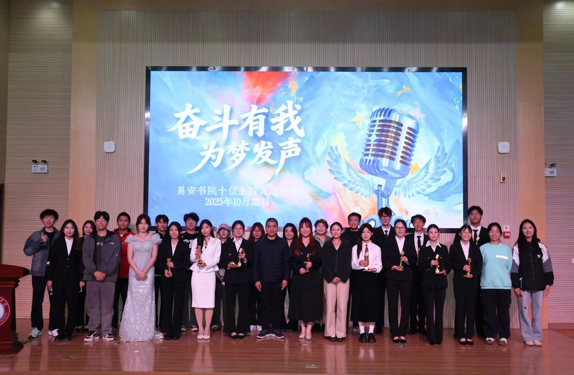 10月(yue)23日晚,“奮斗(dou)有我,為(wei)夢(meng)(meng)發聲(sheng)”十佳(jia)主持人大賽決(jue)(jue)賽在(zai)東報告廳舉行。書(shu)院(yuan)團總(zong)支書(shu)記孫梅玲、部分輔導員及200余名學生(sheng)共同(tong)觀看比(bi)賽。決(jue)(jue)賽圍繞“聲(sheng)入人心”主題(ti),設置“個(ge)性(xing)風采展示”“專(zhuan)業功底呈現(xian)(xian)”“即興主持挑戰(zhan)”三個(ge)環節。選(xuan)手們憑借流暢(chang)的(de)表達(da)、穩健的(de)臺風和靈活(huo)的(de)應變能力,贏得了(le)現(xian)(xian)場觀眾的(de)陣陣掌(zhang)聲(sheng)。比(bi)賽間(jian)隙穿插的(de)舞蹈表演(yan)、詩(shi)歌(ge)朗誦《奮斗(dou)有我為(wei)夢(meng)(meng)發聲(sheng)》和歌(ge)曲(qu)《我是如此相信(xin)》等(deng)節目,進一步豐富了(le)活(huo)動內容。經評選(xuan),謝(xie)安寧獲(huo)一等(deng)獎(jiang),李佳(jia)營、張雨獲(huo)二等(deng)獎(jiang),楊蕊(rui)等(deng)3人獲(huo)三等(deng)獎(jiang),劉麗陽等(deng)4人獲(huo)優秀獎(jiang)。